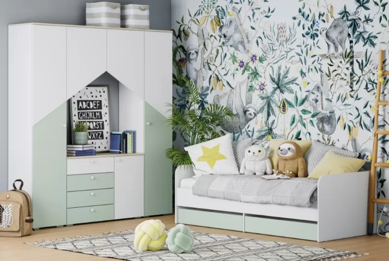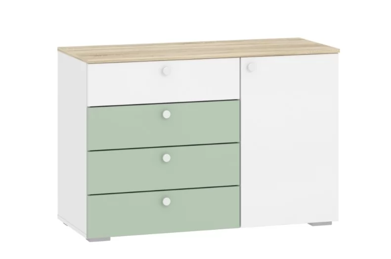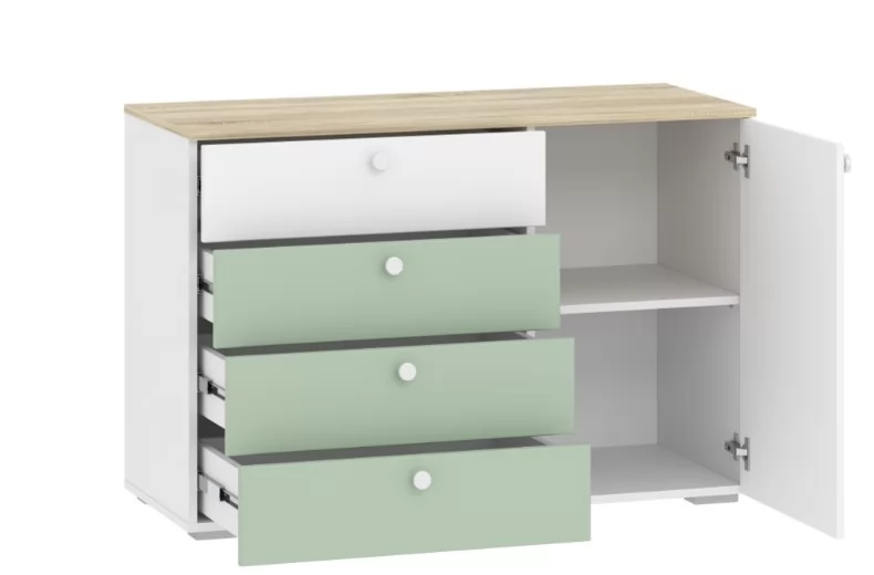 Комод НМ 041.39_Комод Банни прекрасный выбор для интерьера в Скандинавском стиле.Три удобных выдвижных ящика и боковое отделение с полками станут вместительным местом для хранения белья, предметов одежды и аксессуаров. Выдвижные ящики оснащены шариковыми направляющими полного выдвижения, равномерно распределяют вес содержимого и обеспечивают плавный бесшумный ход ящика. Особенности стиля детской «Банни» - это: светлые, спокойные оттенки в единой гамме. Скругленные ручки-кнопки не имеют острых граней. Ящики для хранения белья позволят навести порядок в комнате и расположить вещи. Скандинавская стилистика не любит загромождения мебелью. Только функциональность и практичность. Если правильно спланировать интерьер, в детской будет много места для хранения и пространства для игр. Фасады выполнены из МДФ с покрытием пленкой ПВХ.