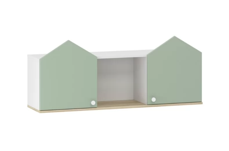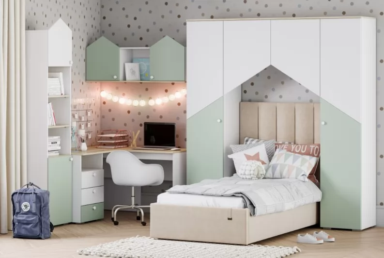 Оригинальный дизайн в виде домиков придаст интерьеру уникальность. Скругленные ручки на ящиках и дверцах делают мебель безопасной для детей.