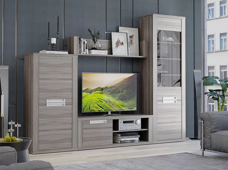 Модульная система «Честерфилд» Корпус модульной системы изготовлен из 38мм, 22 мм и 16 мм ламинированой древесностружечной плиты цвет «Шорвуд». Торцевые поверхности корпуса закромлены кромками ABS. Фасады изготовлены из 16 мм ламинированой древесностружечной плиты цвет «Шорвуд». Торцевые поверхности закромлены кромками ABS. В фасадах выполнена фрезеровка под ручку. - Петли четырехшарнирные с доводчиком плавного закрывания. - Ручки пластиковые врезные. - Стекло серого цвета. - Направляющие шариковые полного выдвижения. - Опоры пластиковые не регулируемые.