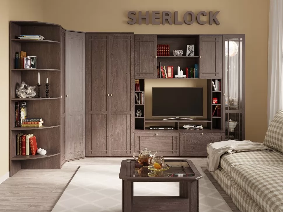Гостиная Шерлок создана в классическом стиле. Главными особенностями коллекции являются: 2 варианта глубины модулей: 394 мм. и 584 мм. Встроенная подсветка. Место под ТВ диагональю до 47 дюймов. Рамочные фасады МДФ с раскладкой и переплетом. Телескопические шариковые направляющие. Возможность самостоятельного декорирования столешницы стола журнального.