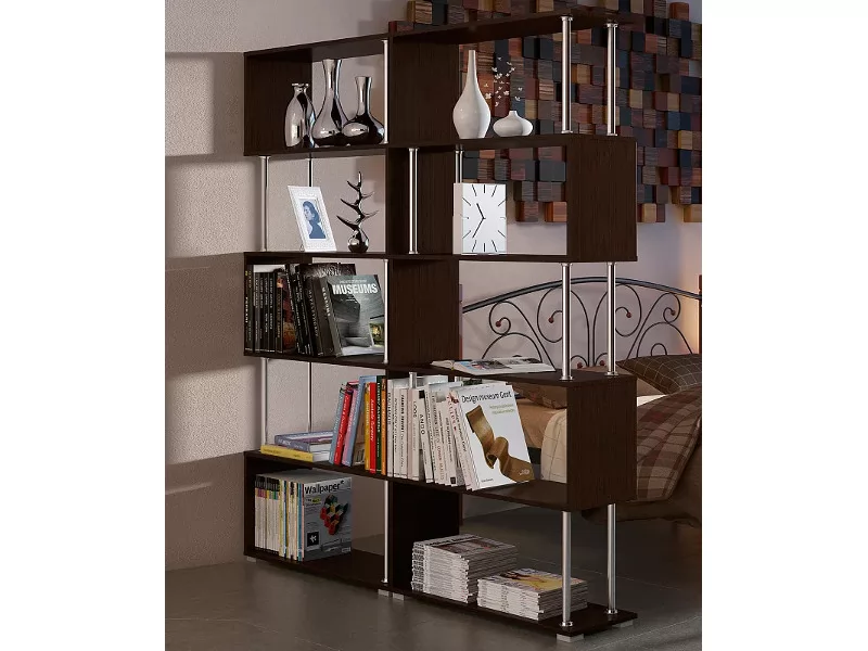 - на нем вы можете разместить все необходимые вещи, включая книги, предметы декора, домашние цветы или фотографии, - невесомости основным полкам стеллажа, выполненным в темном цвете венге, придают хромированные штанги.