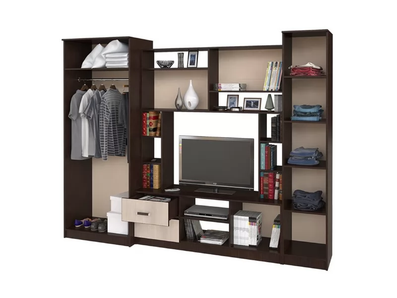 Гостиная «Флора» невероятно вместительный вариант. В ней вы сможете расположить телевизор, всю необходимую аудиотехнику, а верхние и нижние ящики прекрасно подойдут для документов и личных вещей. Кроме того, модель гостиной Флора имеет два полноценных шкафа, один из которых двустворчатый и оснащен штангой для вешалок с вашей одеждой.