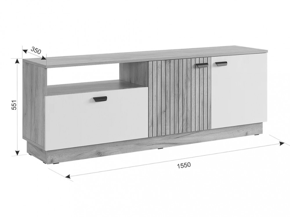 Состоит из: тумбы с дверями, выдвижного ящика и открытой секции.