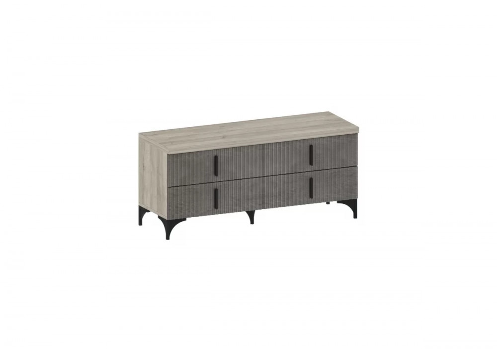 Мебель изготовлена из высококачественного материала ЛДСП — 16 мм, класса эмиссии Е1. Фасады с оригинальной фрезеровкой изготовлены из МДФ 16 мм под пленкой ПВХ в цвете Айронвуд серебро и Лофт голдэн пэлас. Тумбы декорированы крышкой толщиной 32 мм и облицованы кромкой 2 мм.