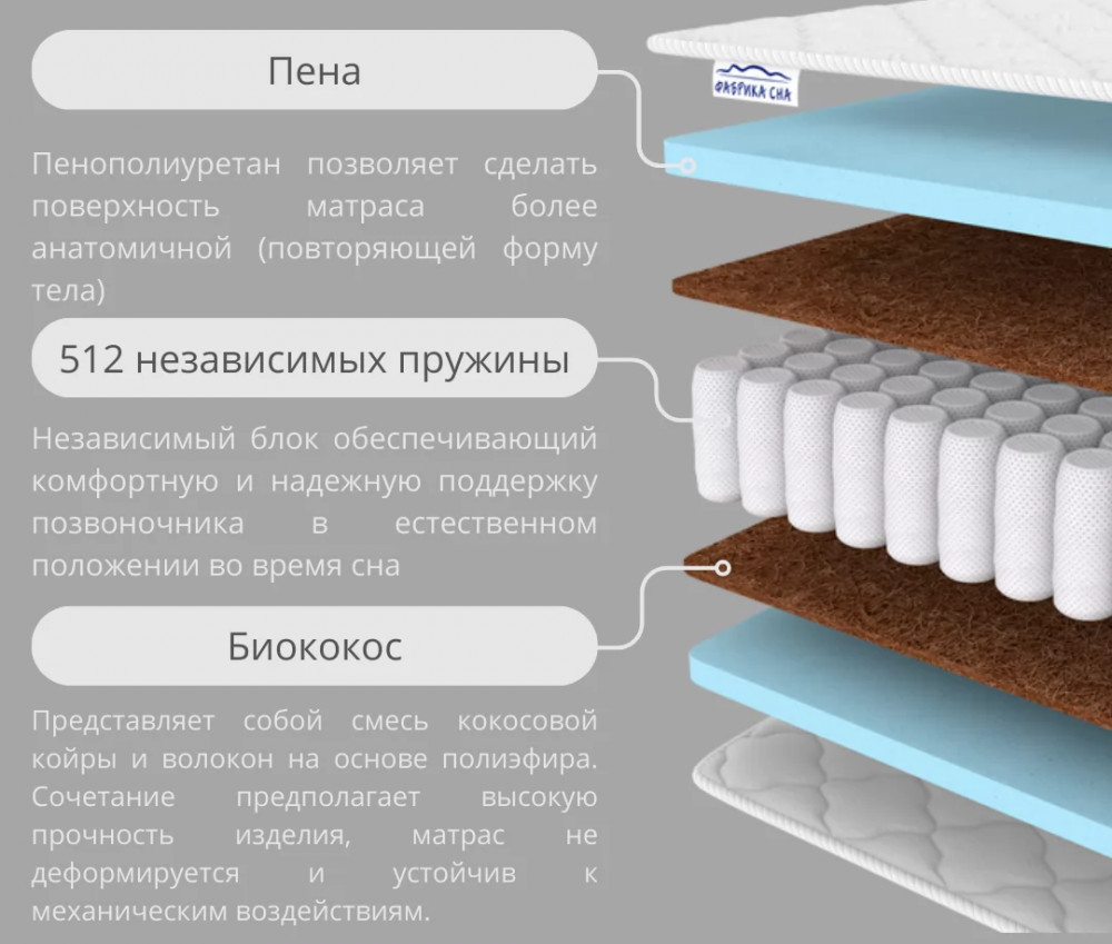 Состав: Пенополиуретан - 3 см/Био-кокос 1 см/Блок независимых пружин/Био-кокос 1 см/ Пенополиуретан - 3 см