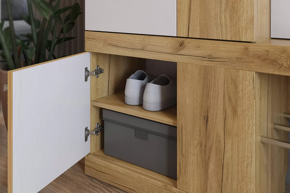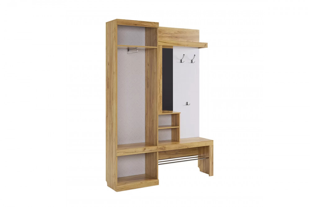Состоит из крючки для одежды, обувницы, открытой ниши для обуви, открытых полок, зеркала, полки для головных уборов, выдвижного ящика, шкафа для одежды.