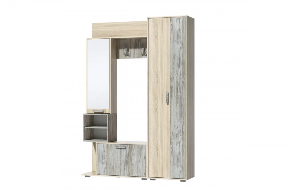 Компактная прихожая "Грейс" представляет собой функциональный модуль для установки во входной зоне студии, в прихожей квартиры или дома, в помещении офиса. В состав изделия входит всё необходимое для удобного хранения одежды, домашней и уличной обуви, головных уборов и сумок.Модуль оснащен секцией с выдвижной штангой для вешалок, открытыми и закрытыми полками, крючками для аксессуаров, тумбой под обувь. Фасад сеции с полками декорирован высоким зеркалом.