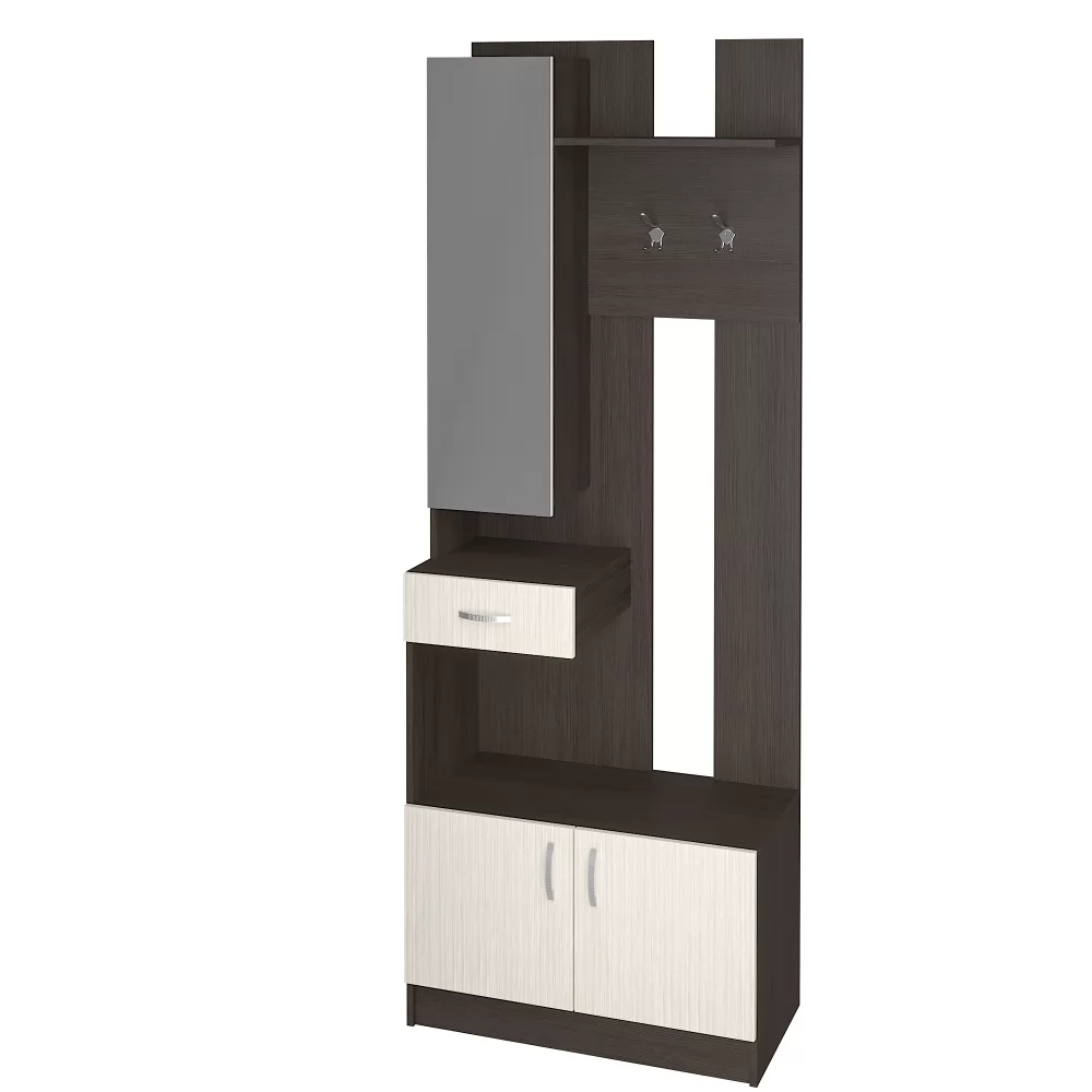 Вешалка отлично подойдет для небольшой прихожей - Ручка пластик - Нижняя тумба с распашными дверками - Ящик для мелочей на роликовых направляющих - Крючки металлические -Универсальная (зеркальная) сборка конструкцией не предусмотрена -Фасад открывается исключительно справа налево