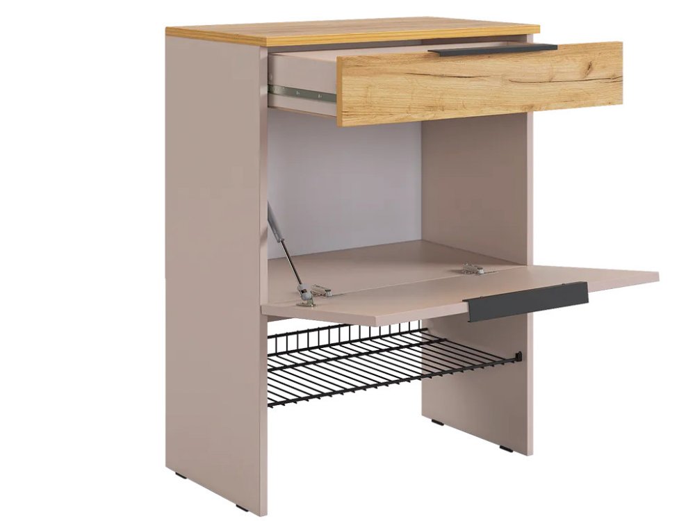 Изготовленная из прочного ЛДСП толщиной 16 мм, обувница обеспечивает надежность и долговечность. Выкатной ящик на шариковых направляющих позволяет легко и плавно открывать и закрывать его, предоставляя дополнительное место для хранения мелочей.