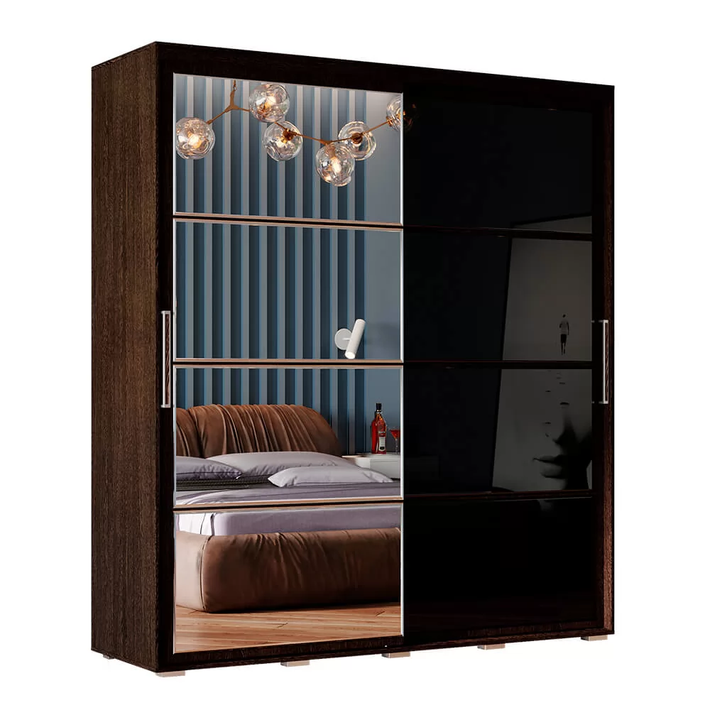 - модель изготовлена из ЛДСП, одна раздвижная створка выполнена из темного стекла, а вторая – зеркальная,