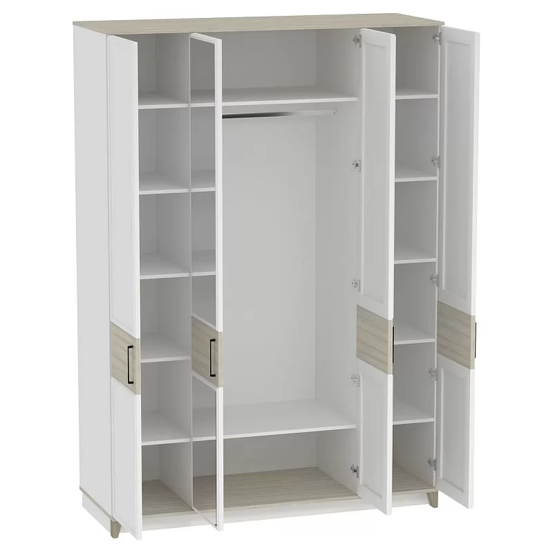 Изысканность стиля подчеркивает тонкий фигурный профиль на фасадах, верх и низ модулей выполнены в древесном декоре, а скошенные опоры из МДФ добавляют мебели в стиле неоклассика из коллекции AURELIO нотку современной эстетики. Петли с доводчиками - для комфортного открывания / закрывания дверок шкафа. Задняя стенка шкафа в древесном декоре устанавливается в паз, поэтому выглядит аккуратно со всех сторон.