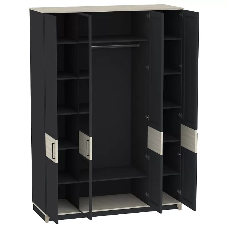 Ширина (мм): 1600 Высота (мм): 2308 Глубина(мм): 600 Материал: ЛДСП,зеркало Цвет: Белый-Блеквуд Сатиновый,Антрацит-Блеквуд Сатиновый Металлические ручки Рамочные фасады из профиля МДФ Стационарная штанга для одежды Полки регулируемые по высоте