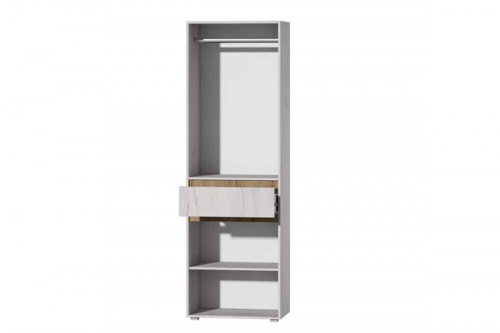 Изящная и функциональная модульная гостиная "Лиана" прекрасно дополнит современный дизайн Вашего пространства, придаст ему легкости и невесомости. Шкаф данной модульной гостиной включает в себя распашные дверцы и выдвижной ящик глубиной 400мм на шариковых направляющих полного выдвижения. В соответствии с Вашими пожеланиями верхняя секция шкафа может содержать полки, либо металлическую штангу для вешалок, так как оба варианта входят в комплект.