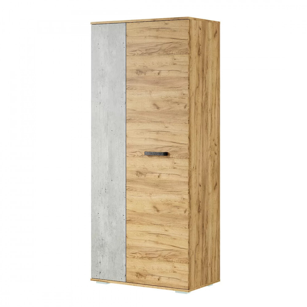 -модель выполнена из ЛДСП натурального оттенка дерева в комбинации со вставкой, эмитирующей бетонную поверхность, -внутренняя комплектация изделия состоит из хромированной штанги для одежды на вешалках и ниш для остальных вещей.