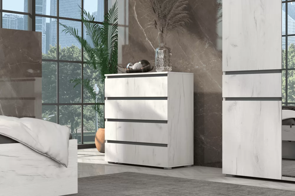 Изящная и функциональная спальня "Лиана" выполнена в модном цвете ЛДСП крафт белый с контрастными вставками цвета графит, либо крафт золотой. Выдвижные ящики комода "Лиана" снабжены шариковыми направляющими полного выдвижения, что обеспечивает плавность хода и удобство пользования.