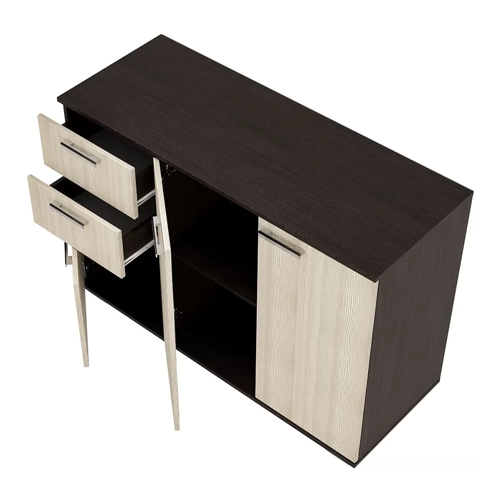 - левая часть комода представляет собой два выдвижных ящика и нижнюю секцию также с распашной дверцей и полками,