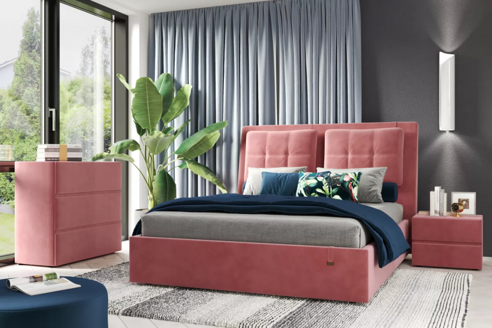 Кровати выполнены в нейтральных и в ярких тканях велюр, что позволяет подобрать подходящий вариант почти под любой интерьер. В качестве декора применяются декоративные подушки на изголовье.