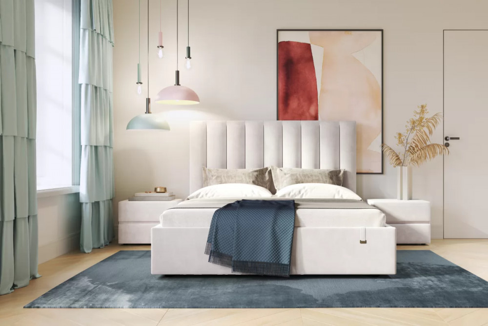 Кровать «Ingrid» подойдет для современных интерьеров спален, впишется в стиль ретро и скандинавский минимализм. Обивка будет отлично сочетаться с любыми цветовыми оттенками отделки и мебели. Кровати выполнены в нейтральных и ярких тканях велюр, что позволяет подобрать подходящий вариант почти под любой интерьер. Изголовье имеет прямоугольную форму, повторяя очертания кровати. Дизайн модели отличается высоким изголовьем с вертикальными строчками и углублениями.