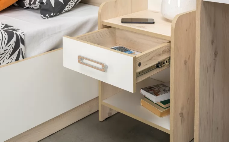 Безопасная тумба скругленными углами, где удобно поставить светильник или положить книгу. Имеется ящик для необходимых мелочей на бесшумной направляющей, полного открывания.