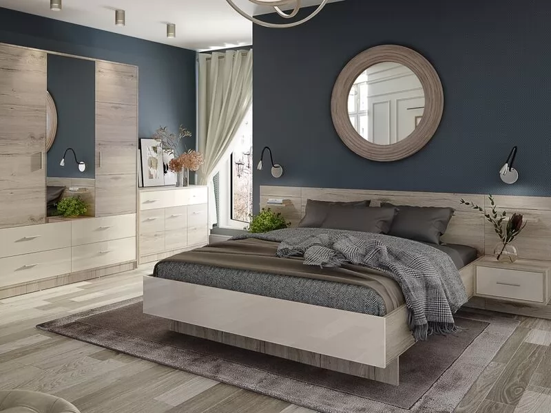 Корпус спальни изготовлен из 16 мм ламинированной древесностружечной плиты цвет –«Дуб Санремо» и «Крем Бежевый». Торцевые поверхности корпуса закромлены кромками ПВХ и ABS. Фасады изготовлены из 16 мм ламинированной древесностружечной плиты цвет –«Дуб Санремо» и «Крем Бежевый». По периметру фасады закромлены кромками ПВХ и ABS. Детали, изготовленные из древесностружечной плиты цвет – «Крем Бежевый», обработаны на лаконаливных машинах имеют высоко глянцевую поверхность .