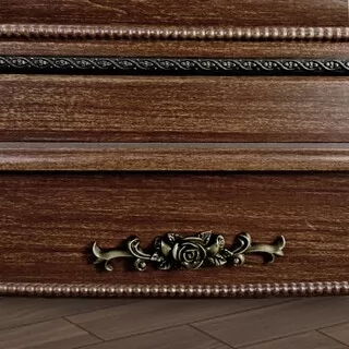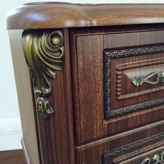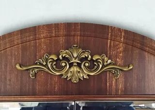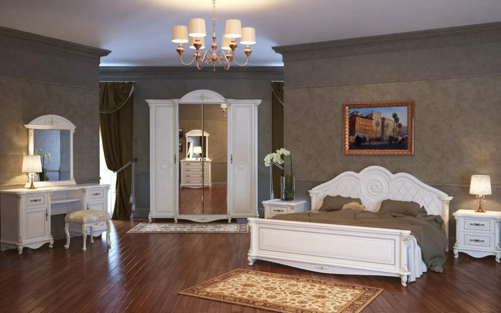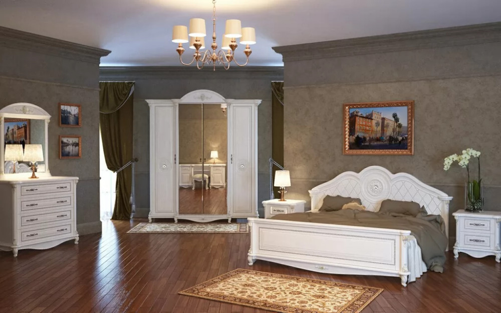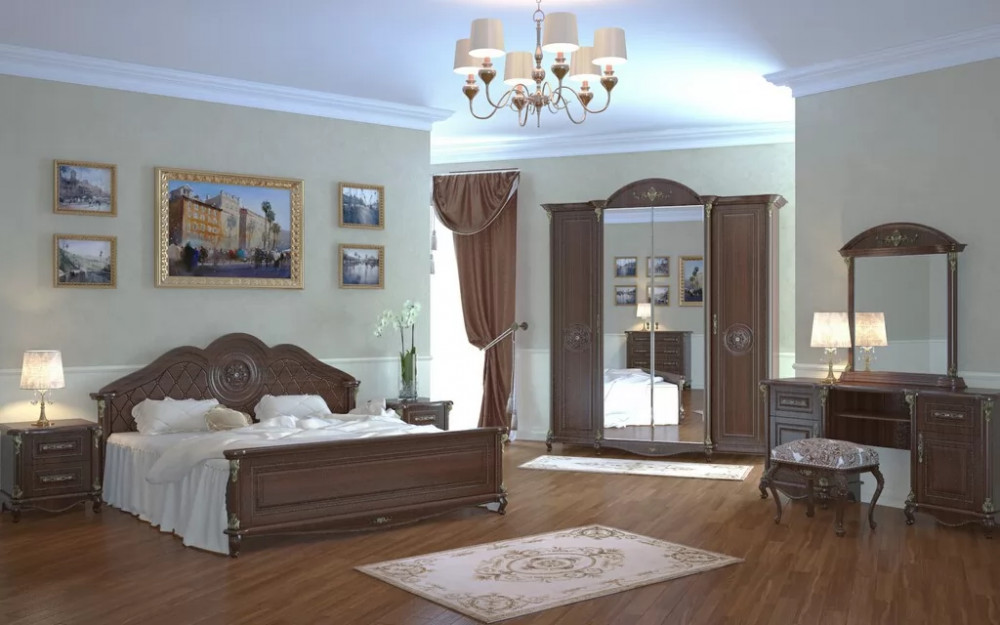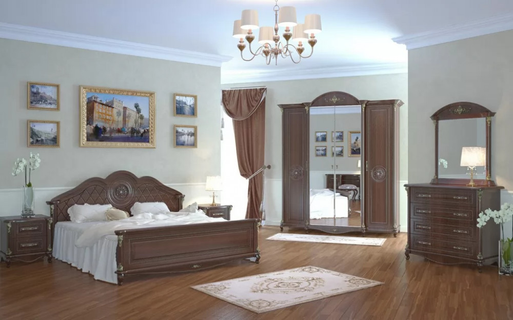 Спальный гарнитур выполнен в классическом стиле. Это изысканный дизайн с резными элементами и декором. Овальное изголовье, рисунки на фасадах, придают мебели для спальни эффект дороговизны и благородства. Такая спальня способна восхищать и удивлять.  Вы можете приобрести как весь комплект, так и по отдельности. Изделия отвечают  всем стандартам и имеют длительный срок эксплуатации.