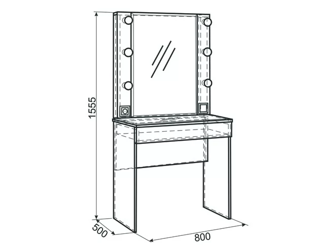 Состоит из: зеркала с подсветкой, встроенного выключателя, розетки для фена, стеклянной столешницы и выдвижного ящика.